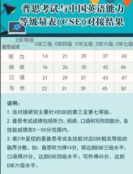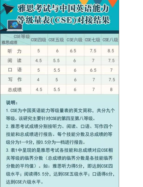 近日,中國教育部考試中心與英國文化教育協(xié)會(huì )聯(lián)合發(fā)布雅思、普思考試與中國英語(yǔ)能力等級量表(以下簡(jiǎn)稱(chēng)“量表”)的對接研究結果。按照對接結果,CSE四級對應雅思4.5分,CSE六級對應雅思6分。